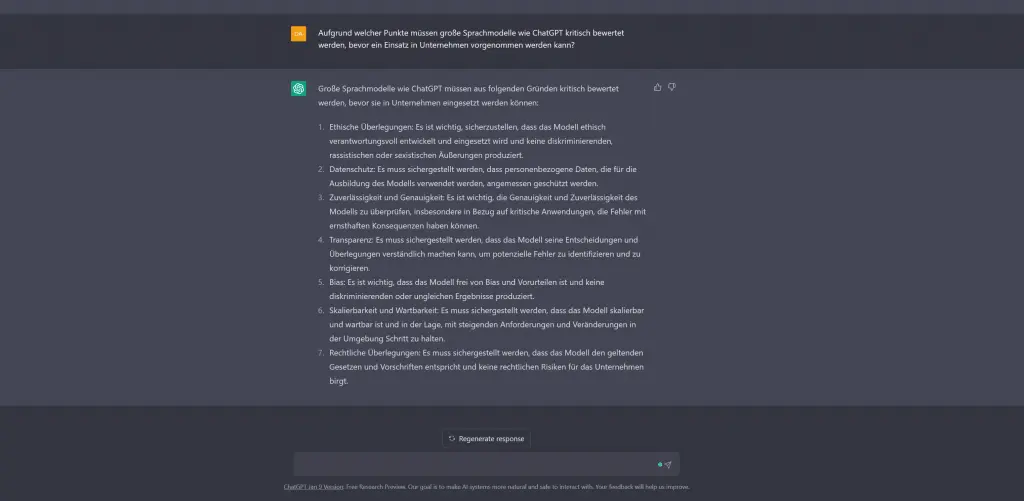 The governance and regulation of the use of AI plays an important role in the discussion about the limitations and boundaries of AI systems such as ChatGPT. In Germany, there are already various efforts to have AI systems certified. One example is the European Commission’s“Trustworthy AI” initiative, which focuses on creating a framework for ethical and responsible applications of AI systems. There are other initiatives from PwC and Deloitte as well as from associations such as the VDE, which focus on creating (ethical) guidelines and standards for the use of AI in companies.