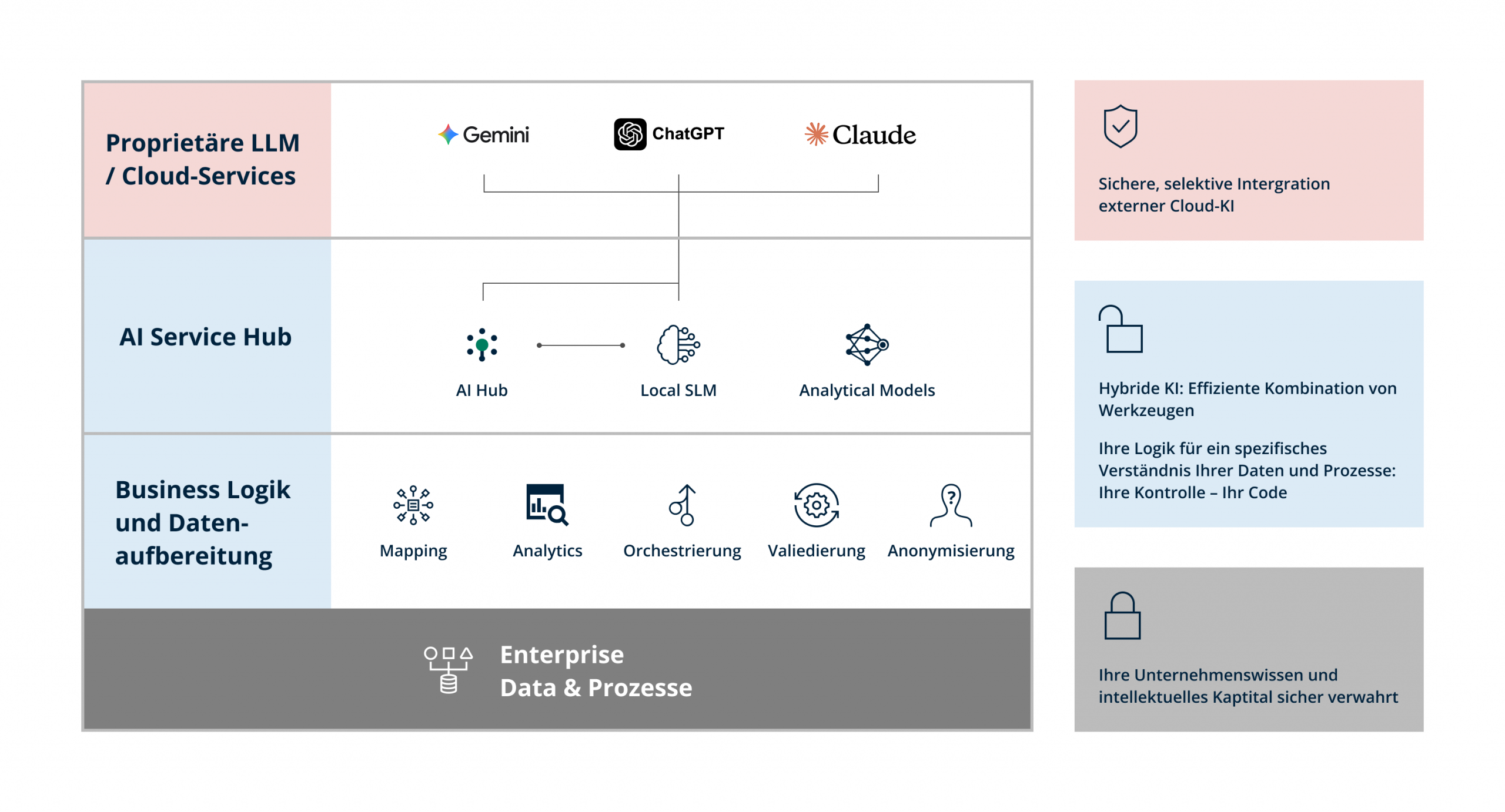 Kein Vendor-Lock-in durch flexible Anbindung beliebiger LLMs (Gemini, ChatGPT, Claude) sowie lokaler SLMs und analytischer Modelle in einer hybriden Architektur.